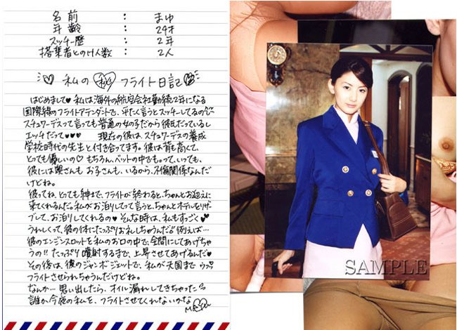 空の旅を彩る華麗な姿のスチュワーデス達が魅せる真実の姿。勤務中は笑顔を絶やさず、隙もみせないスチュワーデスも一皮剥けば欲望の塊、気高いプライドも捨て制服姿のまま痴態をみせつける。そんな彼女達の痴態を生写真5枚と直筆メッセージカード付きで赤裸々に暴く問題作です。